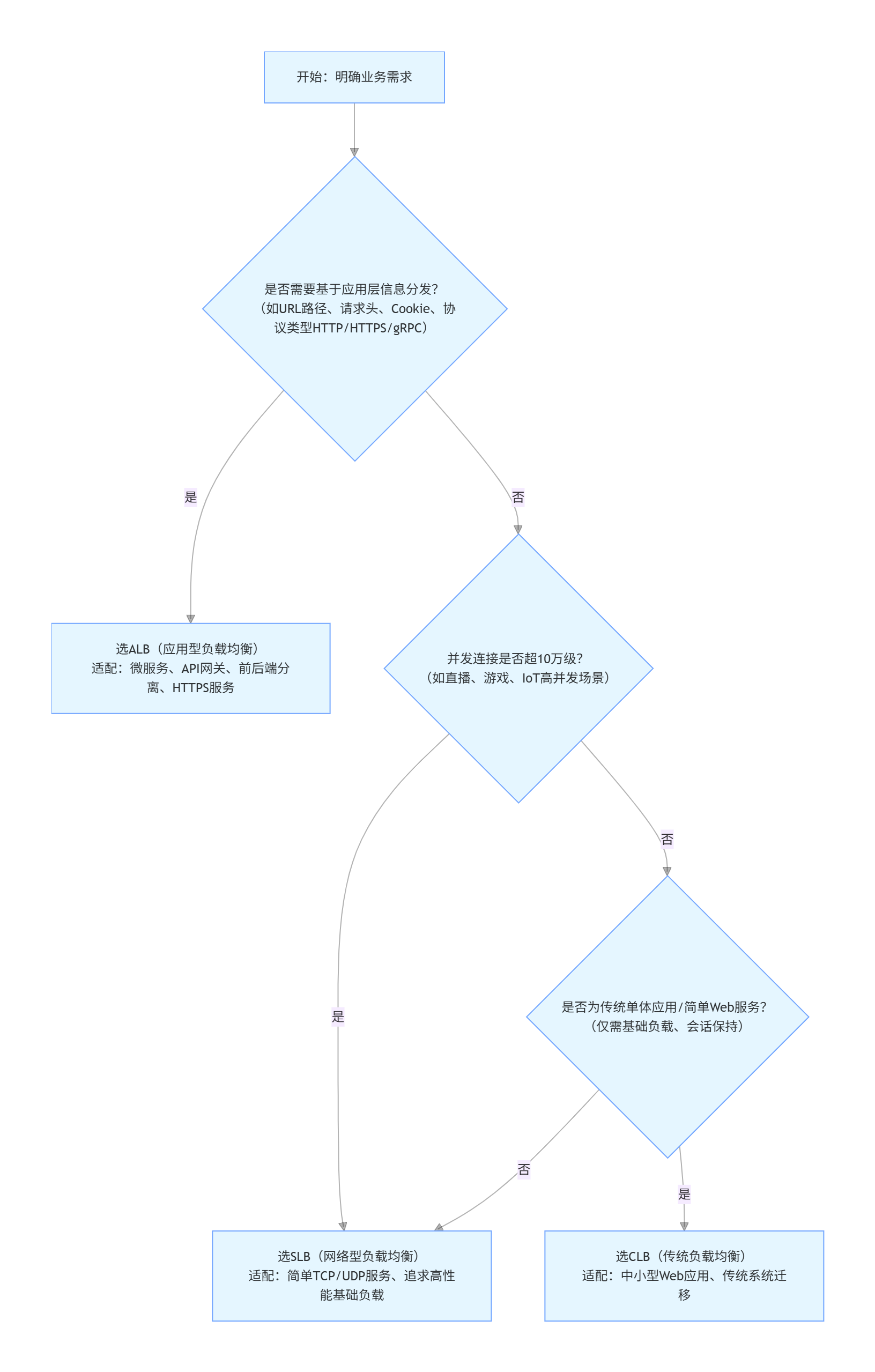 | 1. 并发连接数是否超 10 万级? | 例:直播推流、游戏服务器、IoT 设备批量通信 | 是→SLB;否→CLB/ALB | |